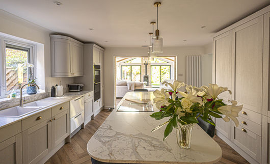New extension to create a family space consisting of kitchen / dining/ living space with new entrance hall in this beautiful property in the heart of the Betchworth countryside - effortlessly transition from the family space into the private gardens with pool.
